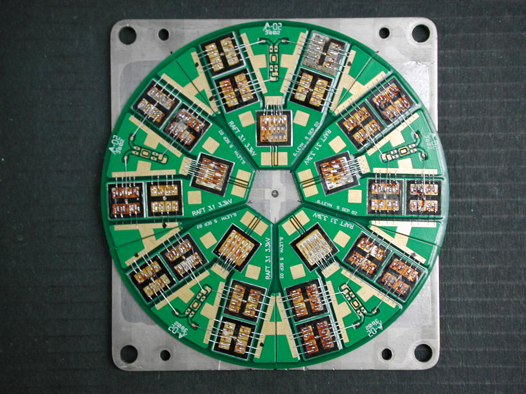 This is the first example of the Rectilinear 5.0 prototype, ready for testing. The four raft substrates are made of FR4, using a standard PC board fab process. The conductors are 10 micron gold flash over 80 micron nickel, over 3oz copper. The nickel provides an 'anvil' for the bonding wires during the ultrasonic bonding process. The substrates are mounted to an backing plate made of an Aluminum Silicon Carbide matrix.