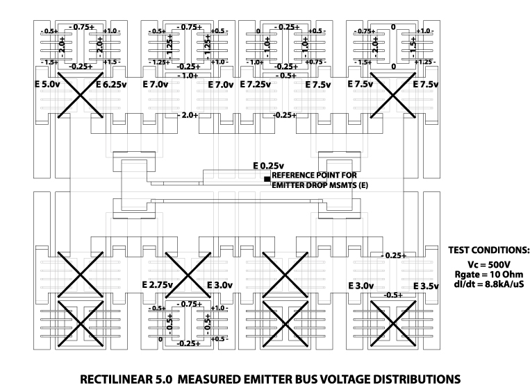 Shown below is a mapping of voltage distributions made on the assembled prototype under high dI/dt conditions. Large 'X's indicate the positions with failed dies. These measurements were taken at 500 volts, which was the lowest possible voltage that could provide a comparable dI/dt. The drive voltage was kept as low as possible to minimize stress on the fragile reclaimed dies.