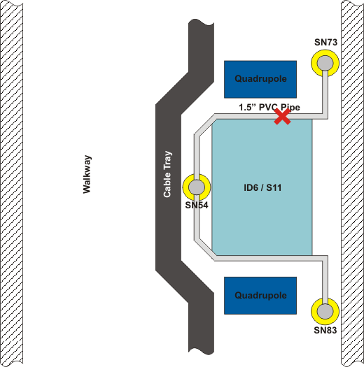 The HLS sensors with serial numbers 54, 73 and 83 are installed around ID6 / S11. Due to thermal expansion of the pipe, the pipe lifted off the supports between SN54 and SN73, therefore the water in the pipe could not flow between the two points. Since the water level at SN73 was not connected to the water level at the other sensors the data could not be analyzed.