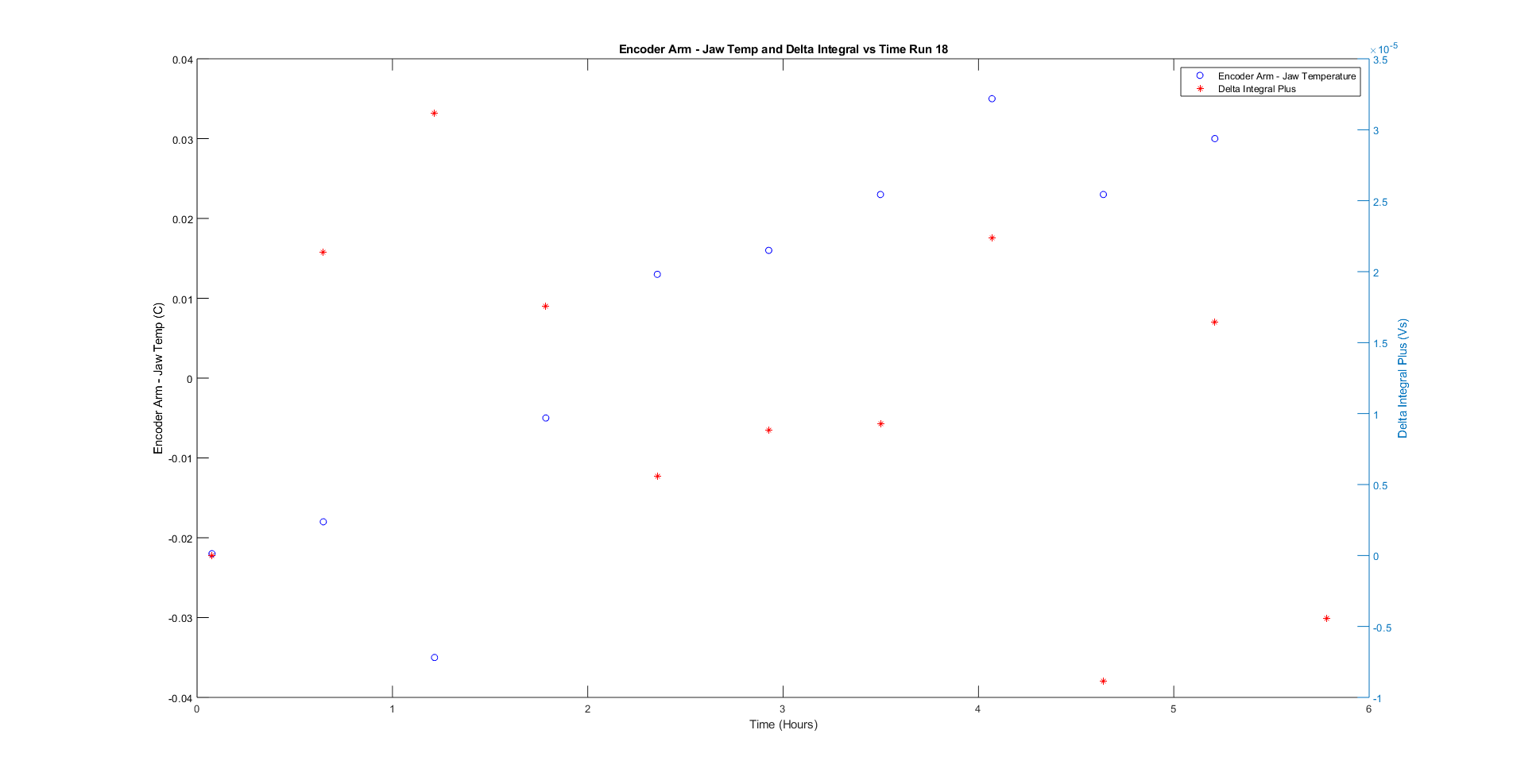 Monday, July 22, 2019 4:42 PM 39441 Encoder Arm - Jaw Temp and Delta Integral vs Time Run18.png